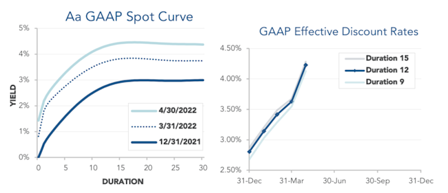 Pension liabilities (for funding, accounting, and de-risking purposes) are driven by market interest rates. The first graph below compares our Aa GAAP spot yield curve at December 31, 2021 and April 30, 2022, and it also shows the movement in the curve last month. The second graph below shows the dramatic increase in effective GAAP discount rates for pension obligations of various duration so far during 2022: