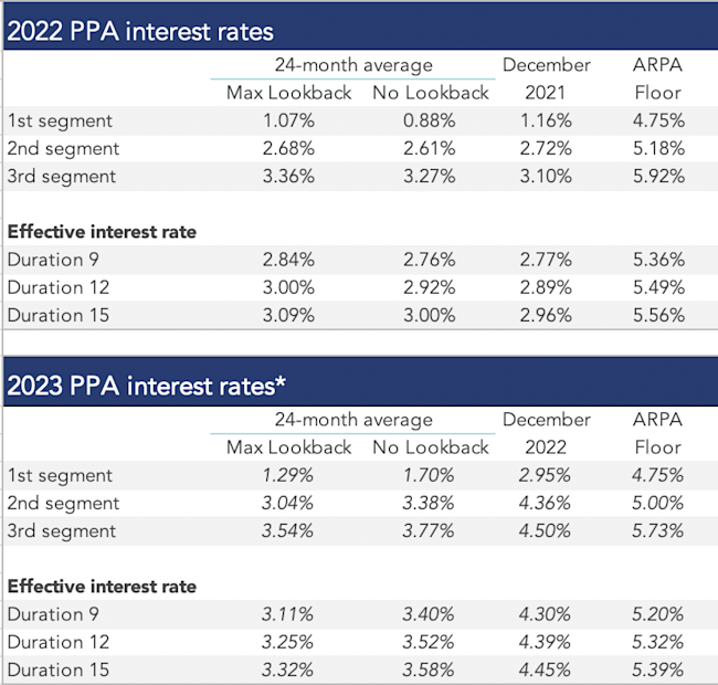 The table below summarizes rates that plan sponsors are required to use for IRS funding purposes for 2022, along with estimates for 2023. Pre-relief, both 24-month averages and December ‘spot’ rates, which are still required for some calculations, such as PBGC premiums, are also included.