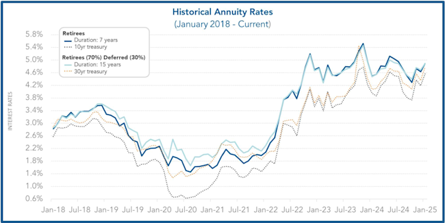 Market uncertainties may be posing challenges for plan sponsors. In this shifting landscape, plan sponsors are encouraged to consult annuity brokers to identify alternative approaches to mitigate risk for their plans. Looking into 2025, market volatility may impact future trends in Pension Risk Transfer. However, LIMRA recently reported there was a 14% increase in single-premium Pension Risk Transfer sales in 2024, which was highly driven by strong first and third-quarter transactions, though sales did see a drop by 7% in Q4.