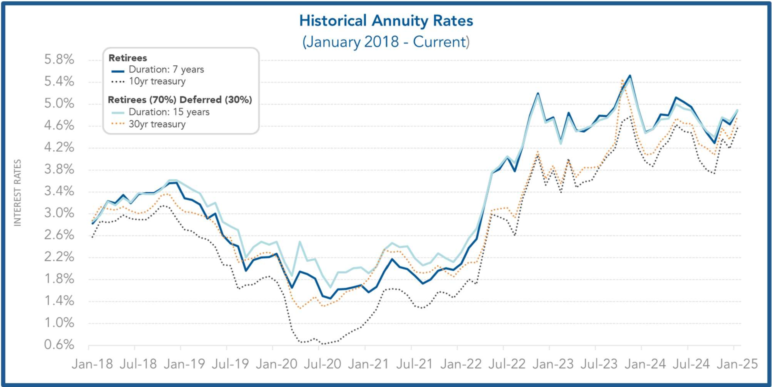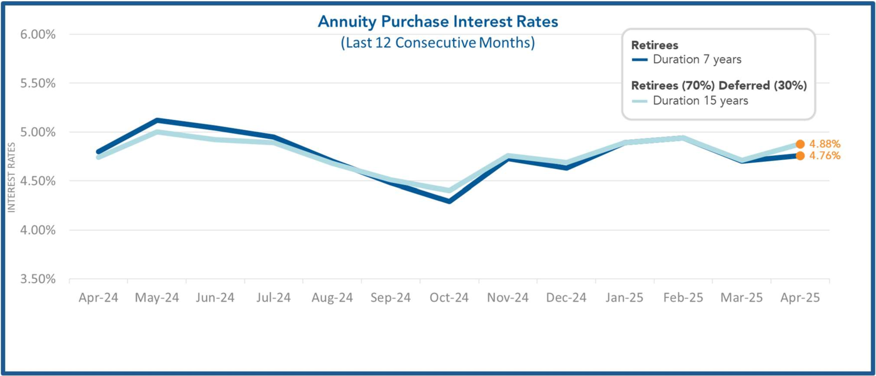 As shown in the graph below, annuity purchase interest rates saw a modest increase last month. Since last month, the average duration 7 annuity purchase interest rate rose 6 basis points and the average duration 15 annuity purchase rate rose 17 basis points. As shown in the graph below, annuity purchase interest rates have been fairly stable thus far in 2025. In the first quarter, the average duration 7 and duration 15 annuity rates were roughly the same at 4.85%. As noted in the Pension Finance Update, pension sponsors faced challenges due to the decline in the U.S. stock markets during the first quarter and we are seeing this downward trend continuing into the second quarter of 2025. Additionally, underfunded plans may face increased required contributions in the years ahead. Given the recent funding losses, it is important for plan sponsors to evaluate the available opportunities and strategies to mitigate risk for their plans. The first step should be to consult with an annuity broker to assess and discuss the evolving market conditions and determine the most effective approach that will align with their plan’s needs.