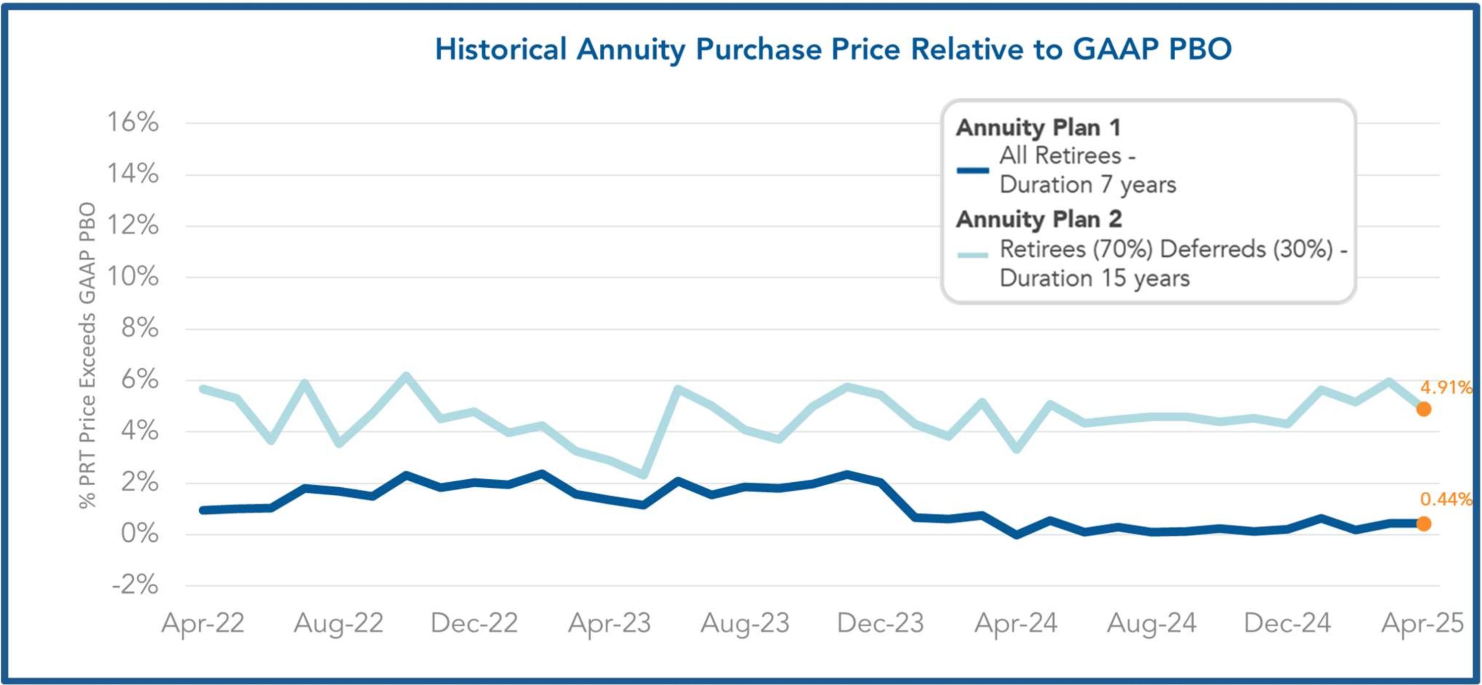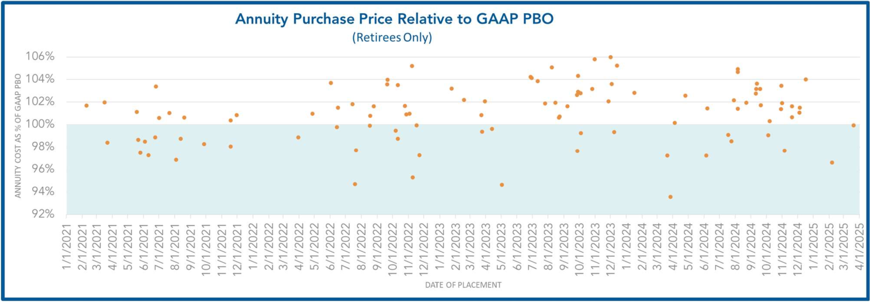 The second graph below represents the annuity purchase price relative to GAAP projected benefit obligation (PBO) of the retiree cases placed by October Three Annuity Services since 2021. In 2023, annuity purchase cost for retirees was on average 102.52% of the accounting book value. In 2024 the average annuity purchase cost of retiree transactions placed by October Three Annuity Services decreased to 101.32% of GAAP PBO as the number of transactions and competition increased. Insurance carriers are pricing aggressively thus far in 2025 as October Three Annuity observed yet another placement closing under 100% of GAAP PBO. We're observing retiree transactions come in as low as 97% of GAAP PBO.