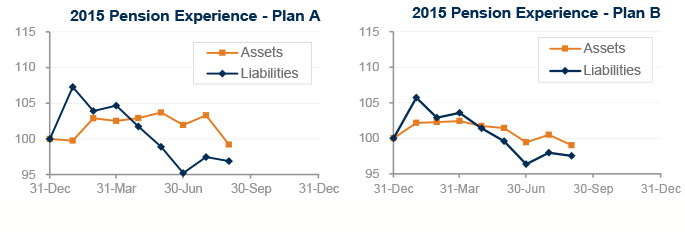 Lower stock markets in August erased much of the improvement pension sponsors had seen this year. Pension assets are now underwater for the year, but still slightly ahead of liabilities, which have fallen more due to moderately higher interest rates during 2015.