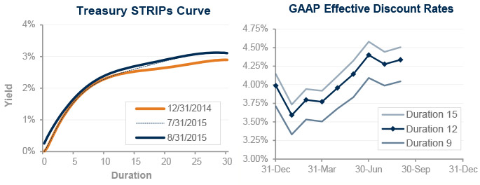Both funding and accounting liabilities are now driven by market interest rates. The graph on the left compares Treasury STRIPs yields at December 31, 2014, and August 31, 2015, and also shows the movement in rates last month. The graph on the right shows our estimate of movements in effective GAAP discount rates for pension obligations of various duration during 2015 so far: