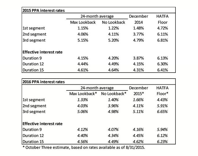 The table below summarizes rates that plan sponsors are required to use for IRS funding purposes for 2015, along with estimates for 2016. Pre-HATFA, both 24-month averages and December ‘spot’ rates, which are still required for some calculations, such as PBGC premiums, are also included.