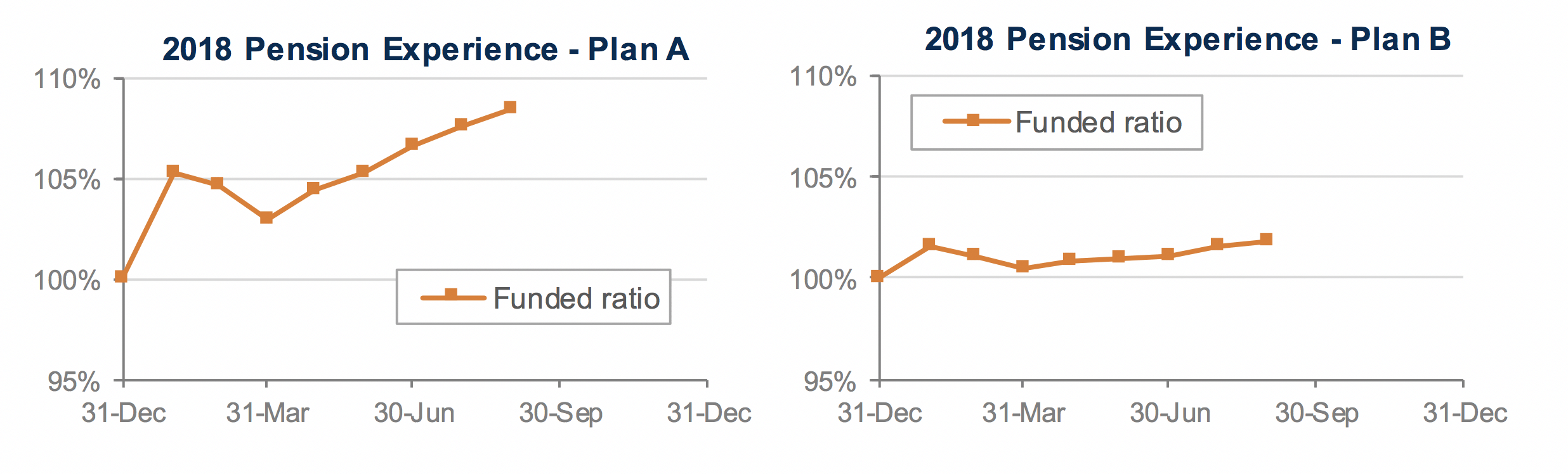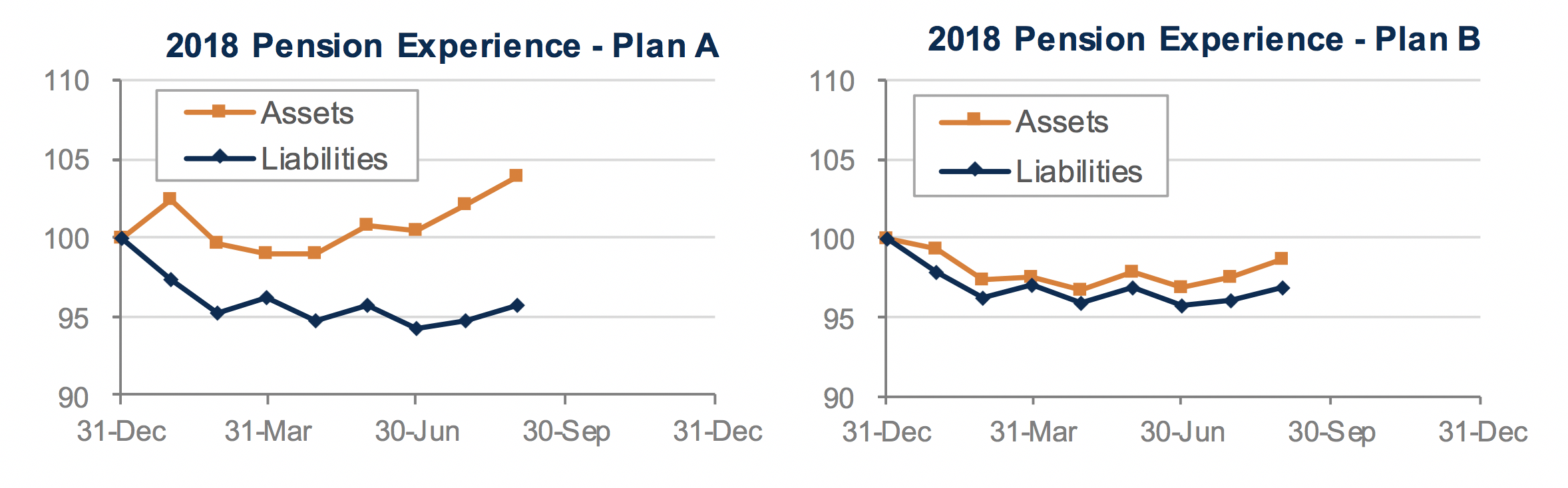 Higher interest rates and solid stock market returns continue to provide the key storylines for pension finance in 2018.The graphs below show the movement of assets and liabilities for our two model plans so far this year: