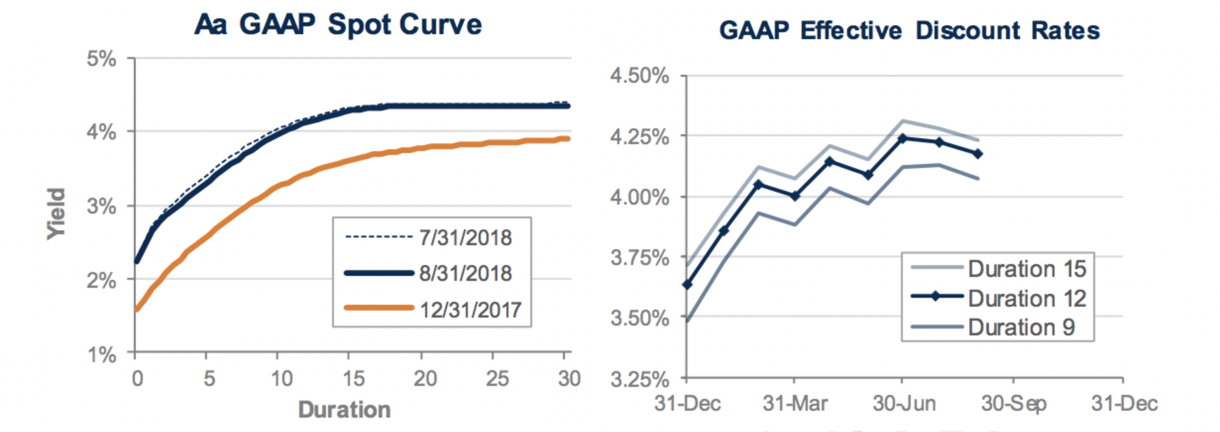 Pension liabilities (for funding, accounting, and de-risking purposes) are now driven by market interest rates. The graph on the left compares our Aa GAAP spot yield curve at December 31, 2017, and August 31, 2018, and it also shows the (tiny) movement in the curve last month. The graph on the right shows our estimate of movements in effective GAAP discount rates for pension obligations of various duration during 2018: