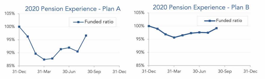 Pensions enjoyed their best month of the year in August, driven by higher stock prices and higher interest rates. Both model plans we track[1] gained ground last month, with Plan A improving 6% and Plan B gaining 1% during August. For the year, Plan A is still down more than 3% and Plan B is down 1% through the first eight months of 2020: