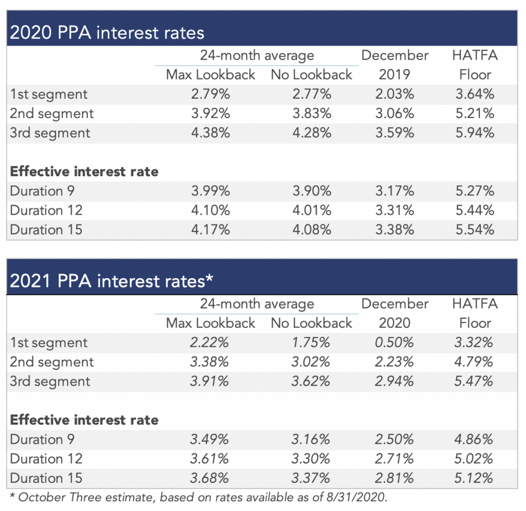 Discount rates moved higher last month. We expect most pension sponsors will use effective discount rates in the 2.3%-2.7% range to measure pension liabilities right now.The table below summarizes rates that plan sponsors are required to use for IRS funding purposes for 2020, along with estimates for 2021. Pre-relief, both 24-month averages and December ‘spot’ rates, which are still required for some calculations, such as PBGC premiums, are also included.