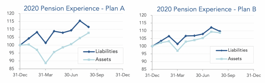It is astonishing, given the social and economic backdrop, how pensions have managed to claw back most of the losses suffered during the first quarter of 2020. The graphs below show the movement of assets and liabilities for our two model plans during the first eight months of the year: