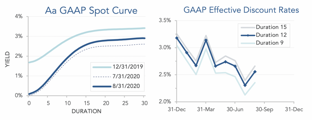 Pension liabilities (for funding, accounting, and de-risking purposes) are driven by market interest rates. The first graph below compares our Aa GAAP spot yield curve at December 31, 2019 and August 31, 2020, and it also shows the movement in the curve last month. The second graph below shows our estimate of movements in effective GAAP discount rates for pension obligations of various duration during 2020: