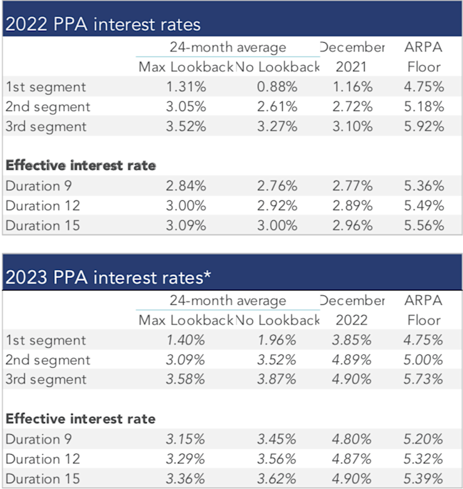 The table below summarizes rates that plan sponsors are required to use for IRS funding purposes for 2022, along with estimates for 2023. Pre-relief, both 24-month averages and December ‘spot’ rates, which are still required for some calculations, such as PBGC premiums, are also included.
