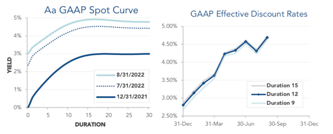 Pension liabilities (for funding, accounting, and de-risking purposes) are driven by market interest rates. The first graph below compares our Aa GAAP spot yield curve at December 31, 2021 and August 31, 2022, and it also shows the movement in the curve last month. The second graph below shows the change in effective GAAP discount rates for pension obligations of various duration so far during 2022: