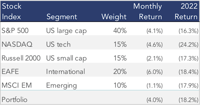 All categories of stocks moved lower during August. A diversified stock portfolio lost 4% in August and is now down 18% so far during 2022: