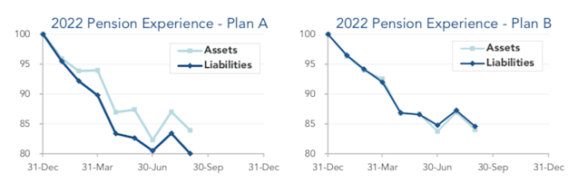 2022 has been a brutal year for stock markets, but pension sponsors have been insulated from falling stock prices by higher interest rates. The net effect has been neutral to modestly positive for most pension plans this year. The graphs below show the movement of assets and liabilities during the first eight months of 2022: