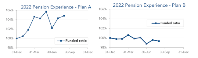 Pension finances were mixed during August, as higher interest rates offset the impact of falling stock markets. Both model plans1 we track were close to even last month: Plan A improved less than 1% and is now up almost 5% for the year, while the more conservative Plan B lost a fraction of 1% in August and is now down 1% through the first eight months of 2022: