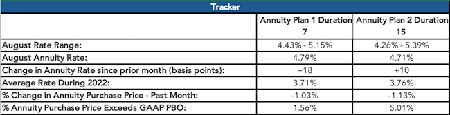 Bustling market activity of the first half of the year carried into the third quarter. Attractive annuity purchase interest rates and improved funding status are driving plan sponsors to de-risk. As of August 1st, average annuity purchase interest rates remained stable since last month, decreasing 1 basis point for the duration 7 rate and increasing 4 basis points for the duration 15 rate. Since then, Fitch's downgrade of US debt drove interest rates to soar 25 basis points. In the last twelve months, the average duration 7 annuity rate increased by 100 basis points, while the average duration 15 annuity rate increased by 80 basis points. As noted in the Pension Finance Update, strong stock market returns and increased interest rates improved pension funding status. Attractive annuity purchase interest rates and improved funding status are driving plan sponsors to settle all or a portion of their pension liability. Insurance companies have noted an increased demand in annuity inquiries this year. There are no indications of marketplace activity slowing down for the rest of the year. It is encouraged to connect with a plan sponsor to enter the marketplace sooner rather than later to lock down favorable rates in this active market.