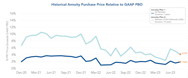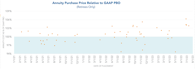 The graph below represents the annuity purchase price relative to GAAP projected benefit obligation (PBO) of the retiree cases placed by October Three Annuity Services since 2021. As we continue into the second half of the year, we will continue to see more placements at October Three. In the first half of 2023, annuity purchase cost for retirees was on average 100.48% of GAAP PBO. Historically, the vast majority of market activity occurred in the third and fourth quarters. This year, insurers have experienced a consistent rush which they anticipate will remain in the second half of the year.