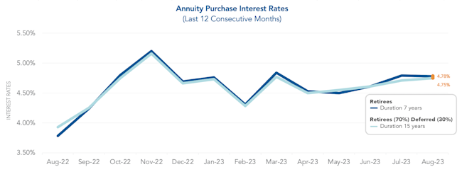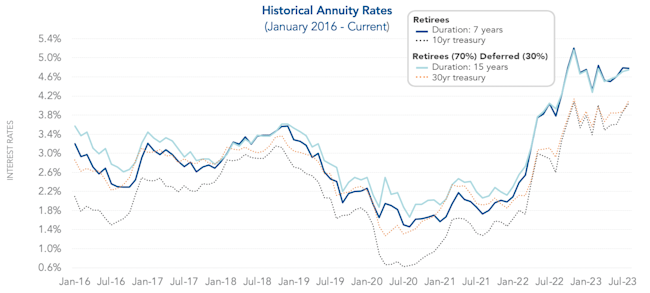 Annuity purchase interest rates moved slightly this past month, with the average Duration 7 annuity purchase interest rate at 4.78% and the average Duration 15 annuity purchase interest rate at 4.75%. The spread between the 10-year treasury rate and 30-year treasury rate widened, placing the two rates 6 basis points apart. As of the beginning of August, the 10-year treasury rate increased to 4.05% and 30-year treasury rate bumped to 4.11%. Thanks to favorable interest rates observed in 2023, market activity is booming. Insurers are experiencing capacity constraints given the volume of placements. Entering the marketplace in a timely manner is important in order to maximize savings.