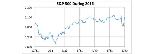 The impact of Brexit has not been confined to the bond market – stocks are also seeing significant volatility. Below is a graph of the S&P 500 index during 2016: