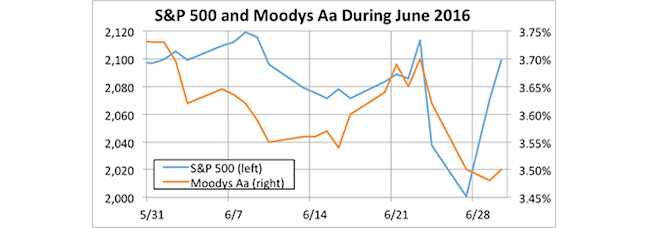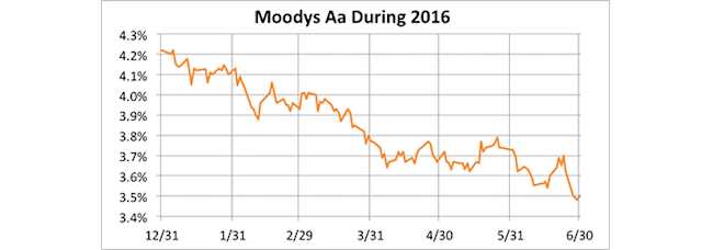We are still finding out what effect Brexit will have on US corporate bond yields. It’s fair to say that it will drive yields down – indeed it already has. But it’s unclear by how much. The downward trend in bond yields since the beginning of the year may be more significant than the effect of Brexit itself, although we don’t really know at this point. The chart below shows Moody’s Daily Long-term Aa Corporate Bond Yield Average for the year, through June 30, 2016.