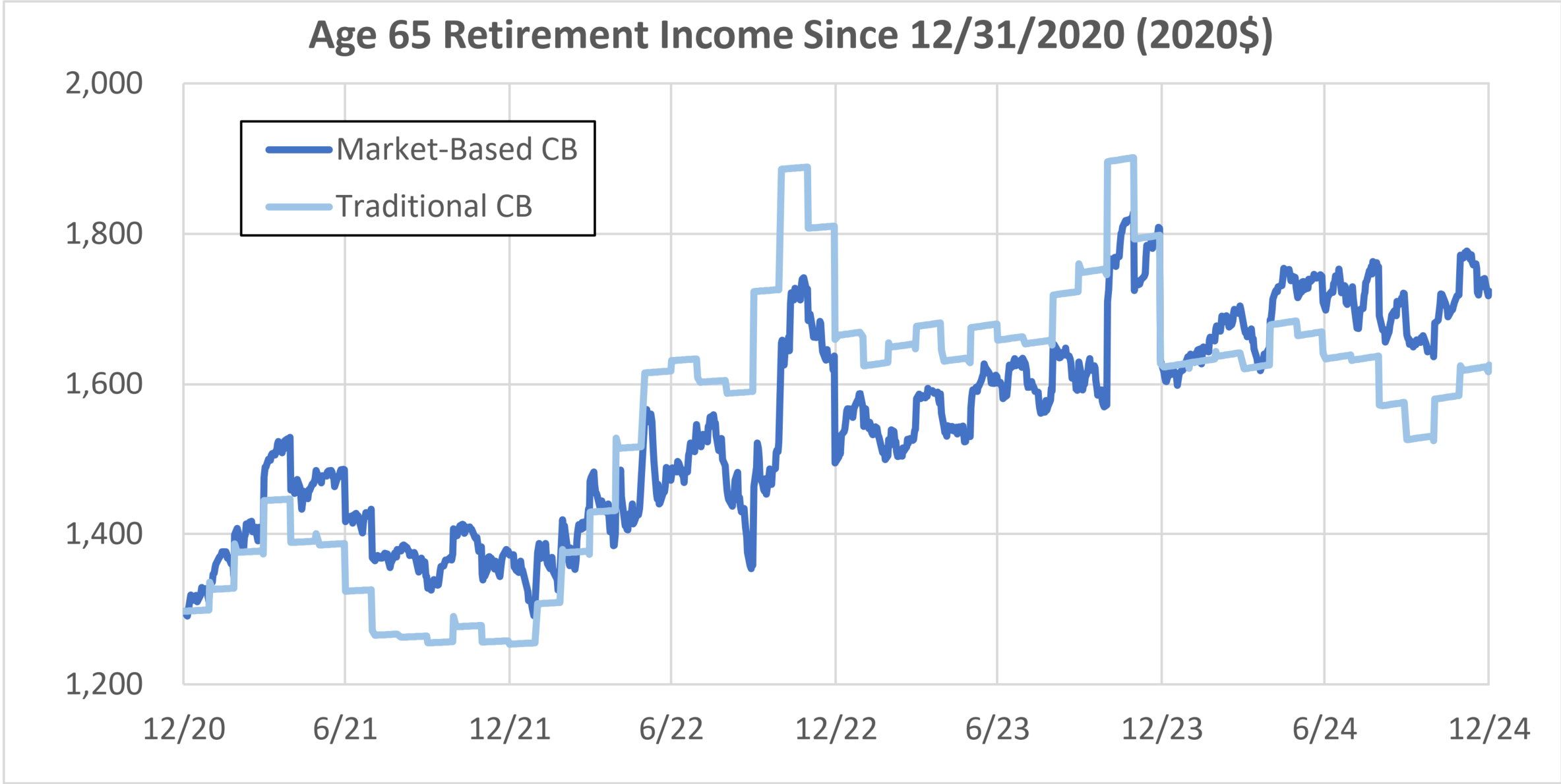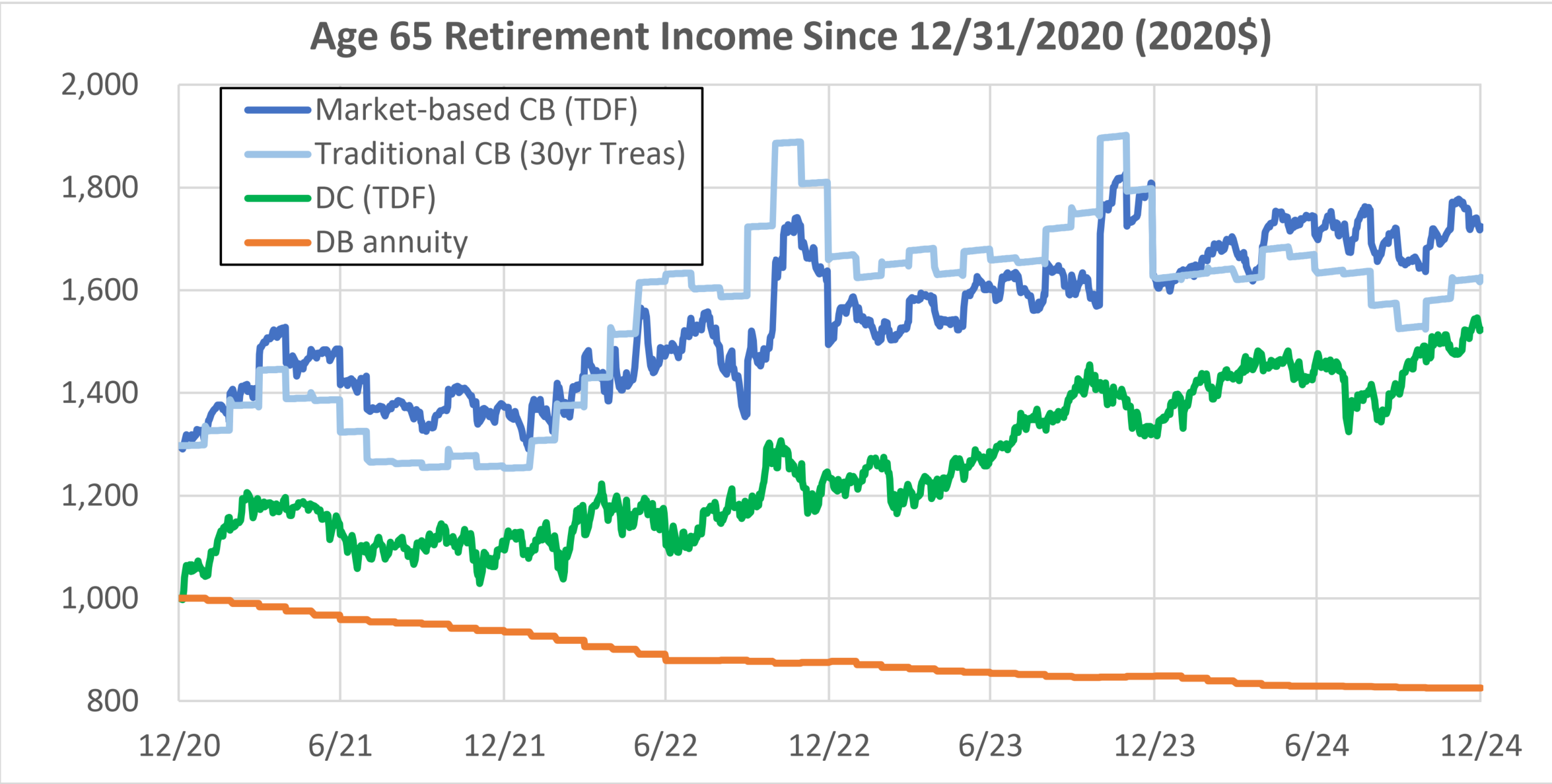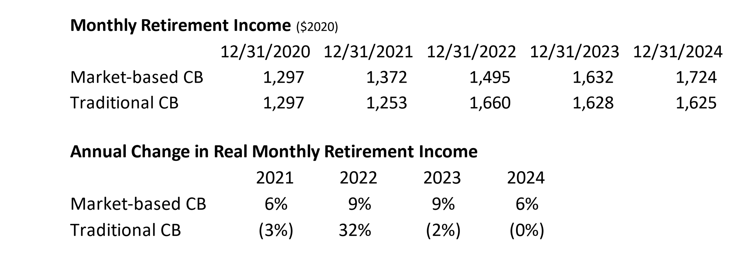 From this perspective, the market-based plan generated steady real increases in retirement income over the past four years, while the traditional plan lost ground every year aside from 2022, when it enjoyed a “windfall” gain in connection with the sharp increase in interest rates we saw that year.