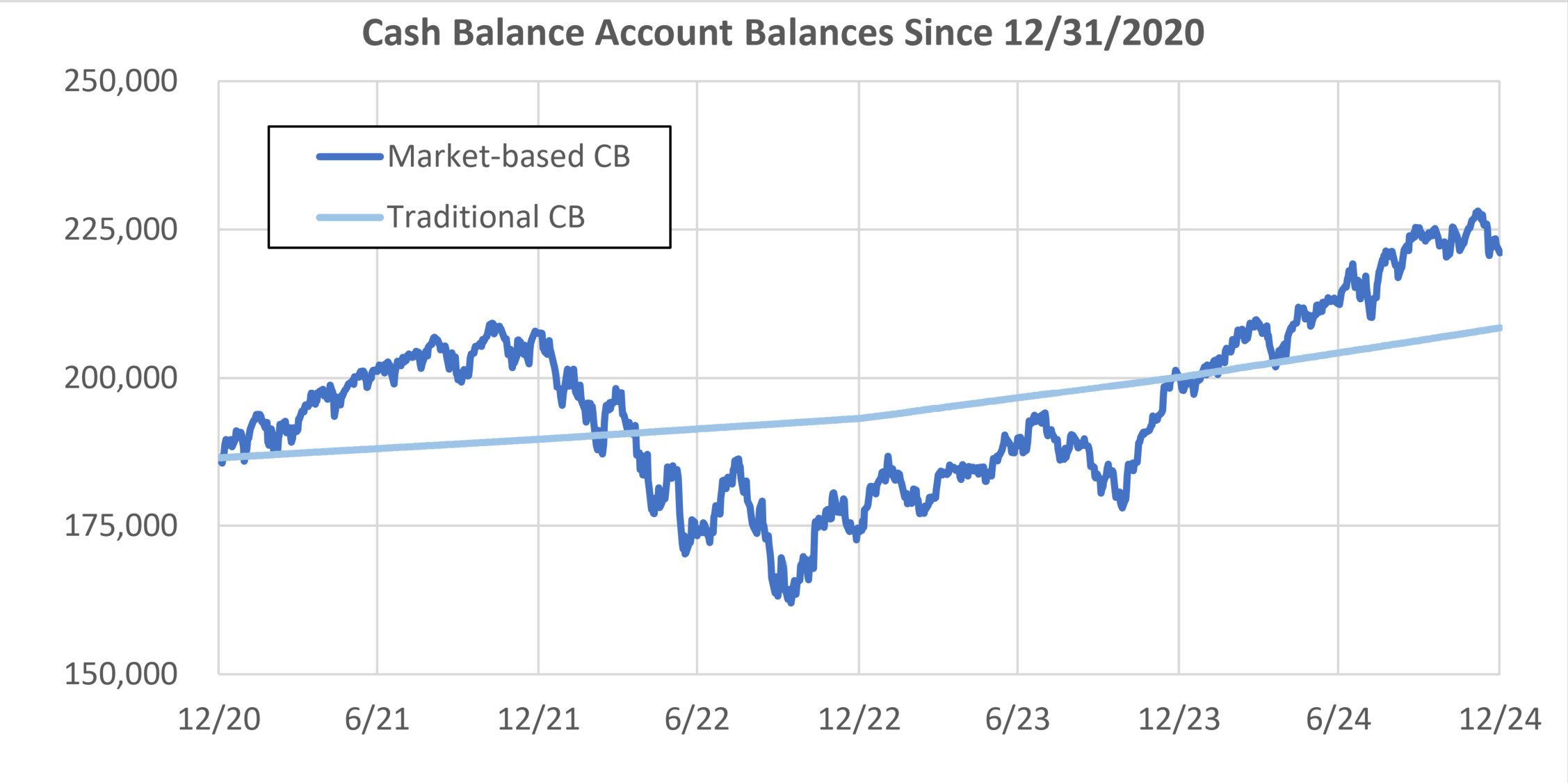 Traditional cash balance interest credits are not correlated with changes in capital markets, so they don’t experience the offsetting impact of changes in interest rates on asset values and the cost of retirement income, increasing retirement income volatility compared to a market-based plan.