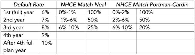 Both the Neal and Portman-Cardin proposals would add a new 401(k) actual deferral percentage (ADP) testing auto-enrollment/escalation safe harbor. The chart below sets forth the default rates and the (differing) matching contribution requirements under the two proposals.