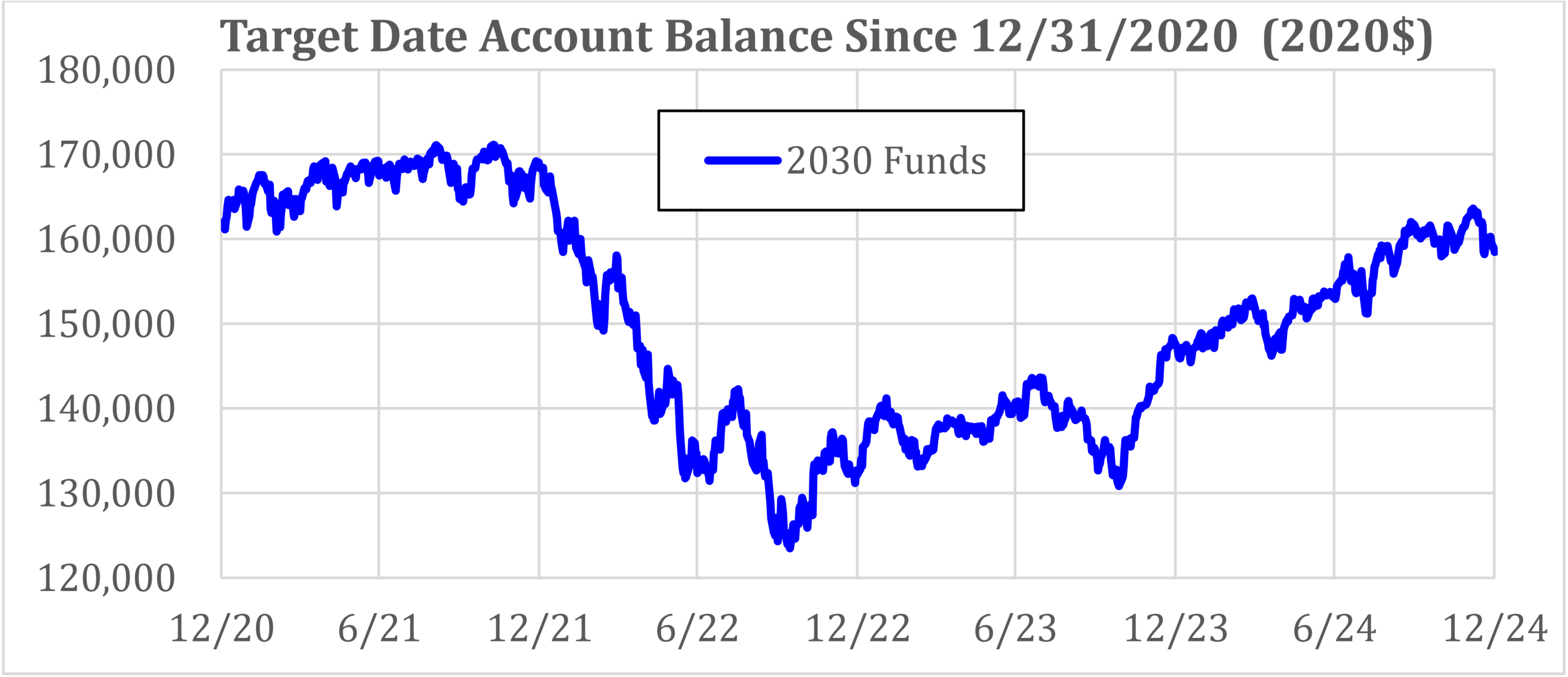 Adjusting for inflation, the value of the account balance at December 31, 2023 (in 2020 dollars) is only $158,491. That’s a 2% decline in purchasing power. If the participant wanted to withdraw his money to buy widgets, he could buy 2% fewer widgets at the end of 2024 than he could at the end of 2020.