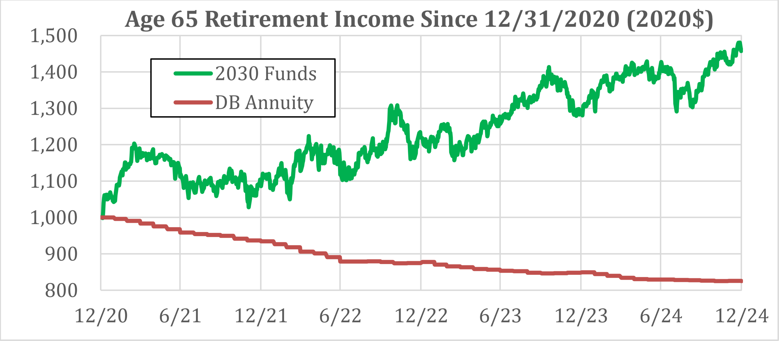 Over the same four years, a DB participant with a $1,000 monthly annuity payable at age 65 – a benefit of equivalent value to the 12/31/2020 TDF – has seen inflation erode the purchasing power of his benefit by 18%.