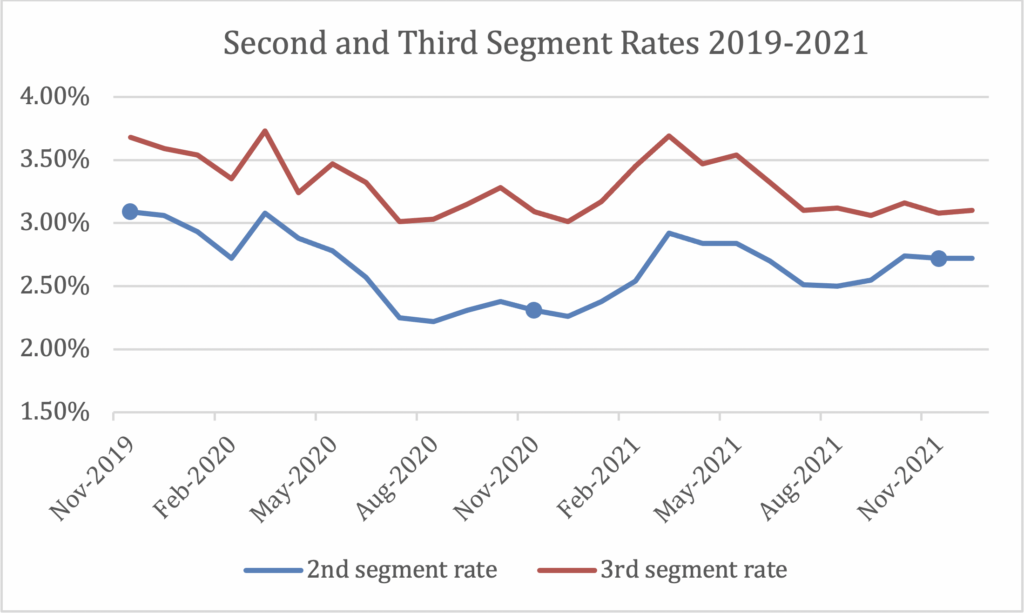 Our analysis reflects the fact that, while somewhat volatile, interest rates increased over 2021, with medium-term (2nd segment) rates up around 40 basis points (longer-term, 3rd segment rates were generally flat). These increasing rates present a number of significant and complicating issues for sponsors considering de-risking.