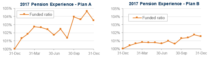 Corporate bond rates fell almost 0.5% during 2017, driving liabilities 8%-12% higher during 2017, with long duration plans seeing the biggest increases.