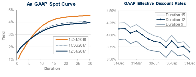 Pension liabilities (for funding, accounting, and de-risking purposes) are now driven by market interest rates. The graph on the left compares our Aa GAAP spot yield curve at December 31, 2016, and December 31, 2017, and it also shows the (small) movement in the curve last month. The graph on the right shows our estimate of movements in effective GAAP discount rates for pension obligations of various durations during 2017: