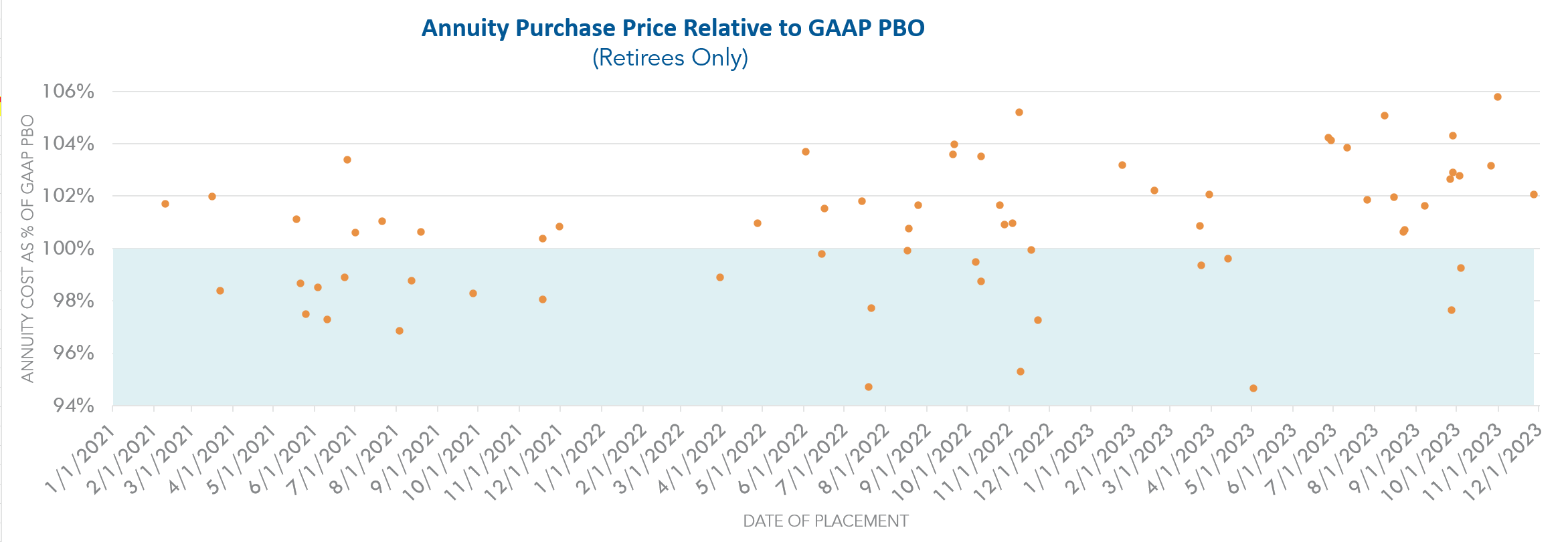 Annuity purchase cost for retiree placements brokered by October Three Annuity Services has on average been 101.02% of the pension accounting value (GAAP PBO).