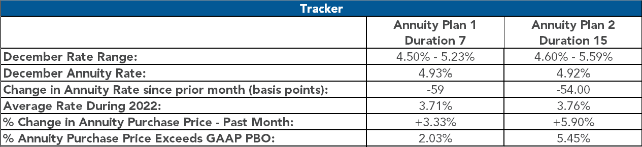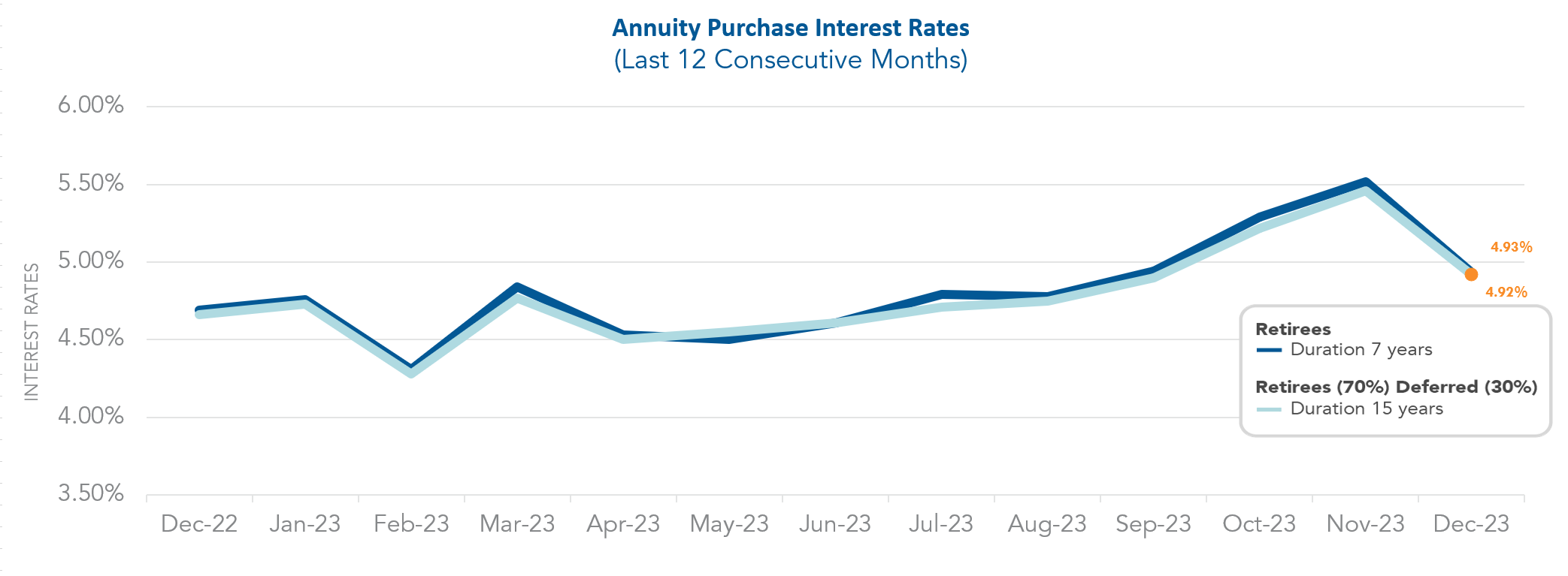 The Pension Risk Transfer market is on track to have yet another record year. The strong momentum in the first half of 2023 carried into the second half. In 2023, we observed a consistent rise in rates, but last month we recorded more than a 50-basis point decrease in the average annuity purchase interest rates. As mentioned in the Pension Finance Update, interest rates declined, but higher stock markets improved asset values. The average duration 7 annuity purchase interest rate dropped to 4.93% and the average duration 15 annuity purchase interest rate declined to 4.92%. Although rates declined, they remain above average for 2023. Although current market conditions aren’t as enticing, insurance carriers remain very busy and expressed they no longer have capacity to take on additional business in 2023. Insurance carriers have already begun preparing for 2024 so we recommend plan sponsors connect with an annuity search firm sooner rather than later to achieve their de-risking goals.