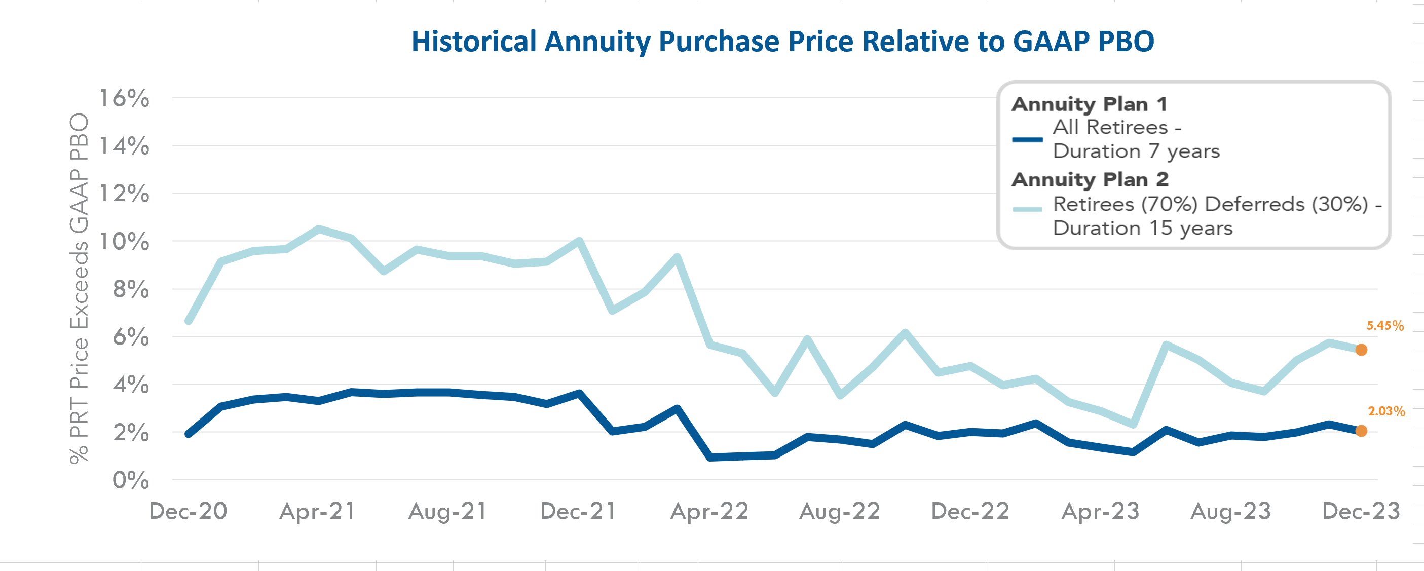 The graph below shows the spread between annuity purchase price above GAAP projected benefit obligation (PBO). We refer to GAAP PBO and accounting book value interchangeably. In December, we noted the spread between annuity purchase price above GAAP PBO for both plans narrowed. For Annuity Plan 1, the spread decreased to 2.03% and Annuity Plan 2 dropped to 5.45%. The current spreads for both hypothetical plans are lower than historical averages, but high with respect to the 2023 average. A decrease in annuity purchase rates inversely increases annuity purchase prices relative to accounting book value. Please note that the below PBO calculations exclude future overhead costs paid by plan sponsors to retain participants in the plan. Administrative expenses and PBGC premiums are examples of these overhead costs.