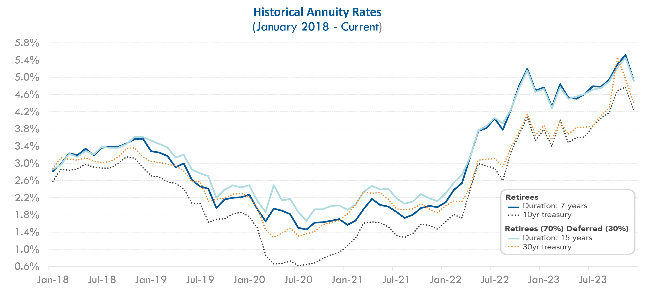 Annuity purchase interest rates and treasury yields continue to demonstrate variations over time. In 2023, we have observed an overall upward trend in both annuity purchase interest rates and treasury rates but this last month we recorded a sharp decline. Since last month, the spread between the 10-year treasury rate and 30-year treasury rate narrowed, placing the two rates 18 basis points apart. Since the beginning of the month, both the 10-year and 30-year treasury rates have continued to decrease.