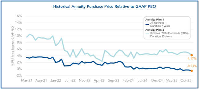 As you can see from the graph below, the last two quarters of 2025 have been notably stable, with minimal variation in both the average duration 7 and average duration 15 annuity purchase interest rates. Going into December, the average duration 7 rate experienced a modest decline of two basis points from last month, settling at approximately 4.62%. In contrast, the average duration 15 rate increased slightly, rising one basis point to reach 4.80%. With insurance carriers reaching capacity constraints for 2025, it is crucial for plan sponsors to engage with a pension risk transfer specialist early in the year to ensure a timely execution. This period presents a strategic window for plan sponsors to address their defined benefit plan liabilities. As 2025 comes to an end, momentum in the pension de-risking landscape remains strong, prompting insurers to already be actively preparing for anticipated transaction activity in 2026.