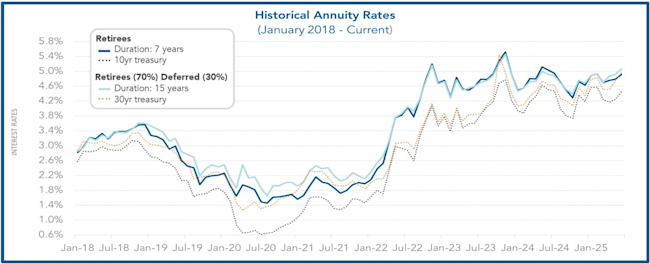 Annuity purchase interest rates and treasury yields continue to fluctuate over time, reflecting ongoing variations in market conditions. In 2025, the 10-year treasury rate averaged about 4.30% year to date and the 30-year treasury rate averaged around 4.77% year to date. Both averages were higher than the corresponding averages observed in 2024. At the start of this month, the 10-year treasury rate started at about 4.09% and the 30-year treasury rate at 4.74%. Both rates have shown continued increase since that initial observation.