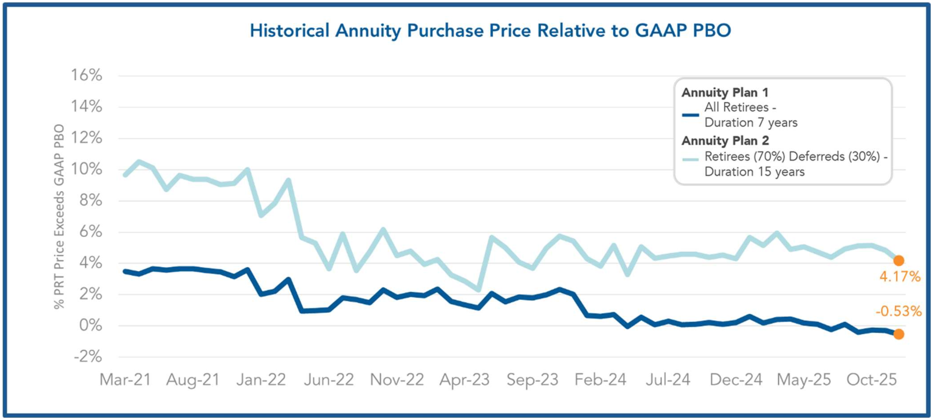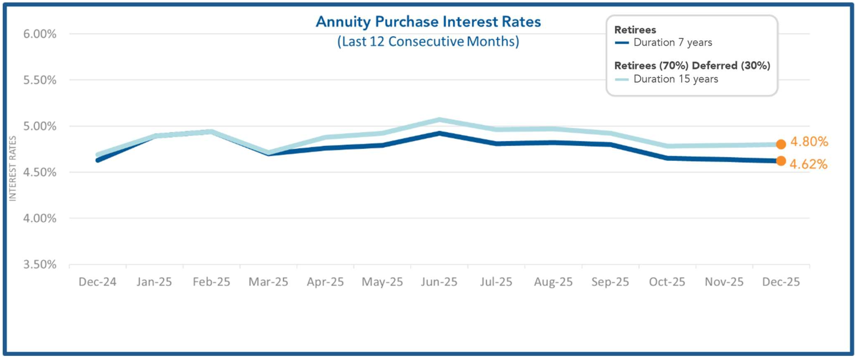 As you can see from the graph below, the last two quarters of 2025 have been notably stable, with minimal variation in both the average duration 7 and average duration 15 annuity purchase interest rates. Going into December, the average duration 7 rate experienced a modest decline of two basis points from last month, settling at approximately 4.62%. In contrast, the average duration 15 rate increased slightly, rising one basis point to reach 4.80%. With insurance carriers reaching capacity constraints for 2025, it is crucial for plan sponsors to engage with a pension risk transfer specialist early in the year to ensure a timely execution. This period presents a strategic window for plan sponsors to address their defined benefit plan liabilities. As 2025 comes to an end, momentum in the pension de-risking landscape remains strong, prompting insurers to already be actively preparing for anticipated transaction activity in 2026.