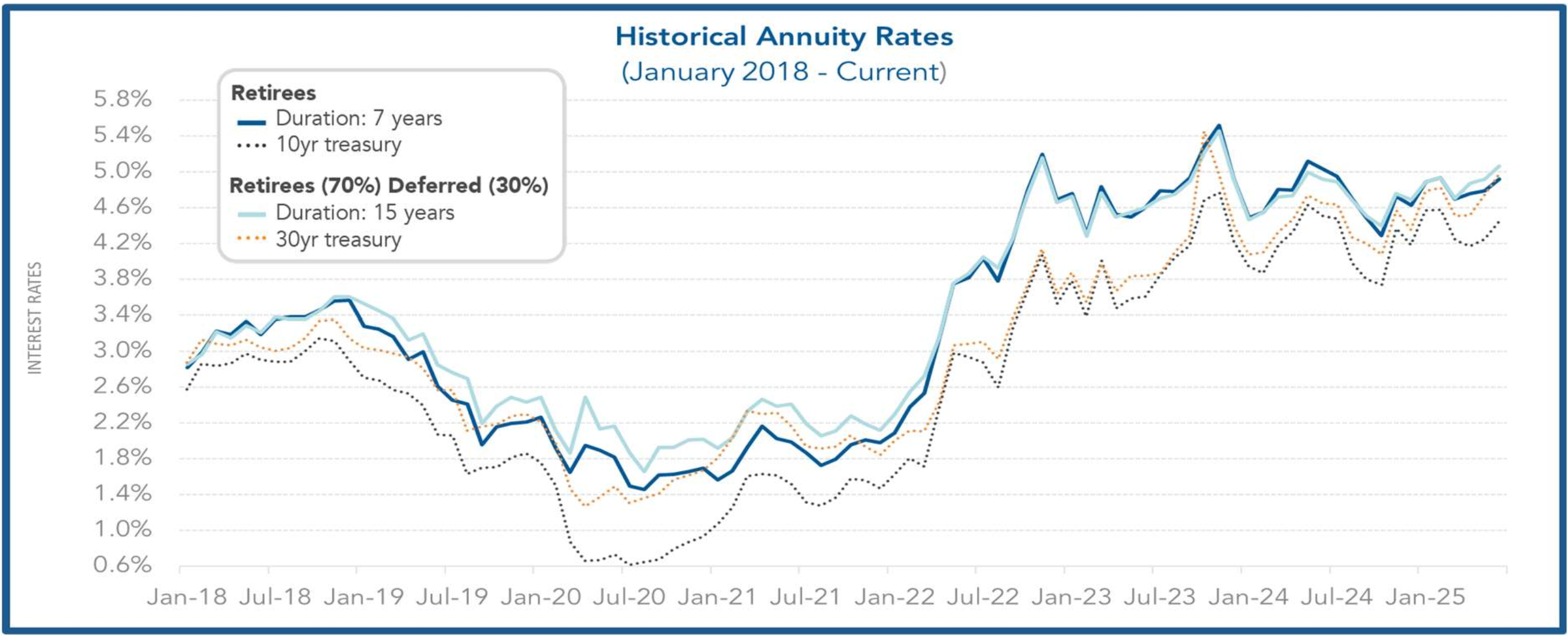Annuity purchase interest rates and treasury yields continue to fluctuate over time, reflecting ongoing variations in market conditions. In 2025, the 10-year treasury rate averaged about 4.30% year to date and the 30-year treasury rate averaged around 4.77% year to date. Both averages were higher than the corresponding averages observed in 2024. At the start of this month, the 10-year treasury rate started at about 4.09% and the 30-year treasury rate at 4.74%. Both rates have shown continued increase since that initial observation.
