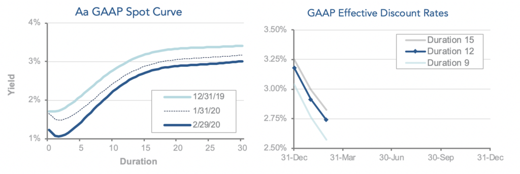 Pension liabilities (for funding, accounting, and de-risking purposes) are driven by market interest rates. The first graph below compares our Aa GAAP spot yield curve at December 31, 2019 and February 29, 2020 and it also shows the movement in the curve last month. The second graph below shows our estimate of movements in effective GAAP discount rates for pension obligations of various duration during January: