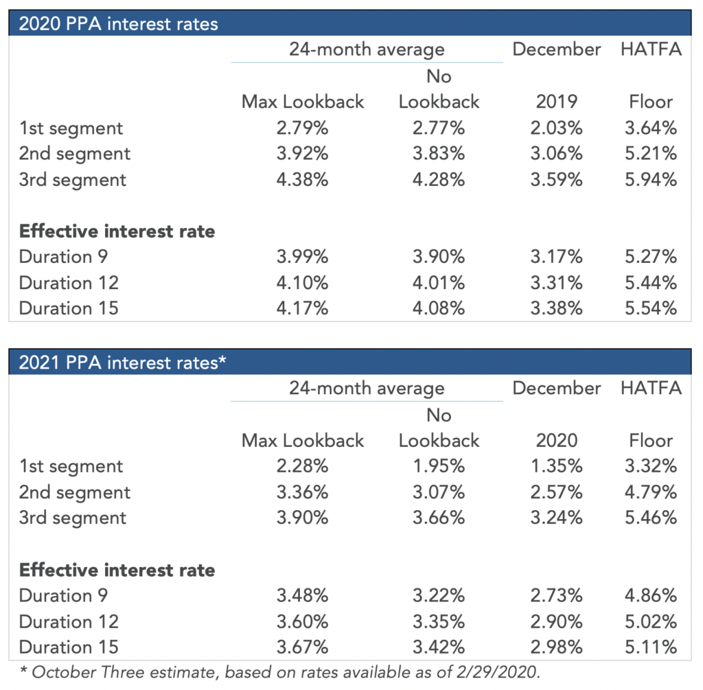 The table below summarizes rates that plan sponsors are required to use for IRS funding purposes for 2020, along with estimates for 2021. Pre-relief, both 24-month averages and December ‘spot’ rates, which are still required for some calculations, such as PBGC premiums, are also included.