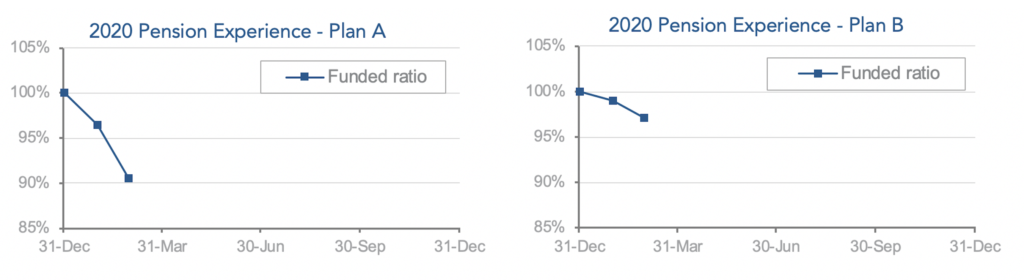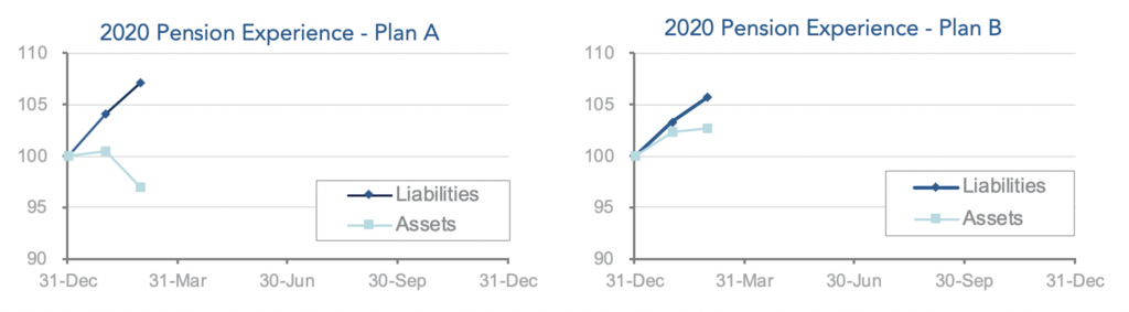 Falling stock markets grab the headlines, but unprecedented low interest rates are at least as significant a story. For pension sponsors, the combination is a real gut check. The graphs below show the movement of assets and liabilities during the first two months of 2020: