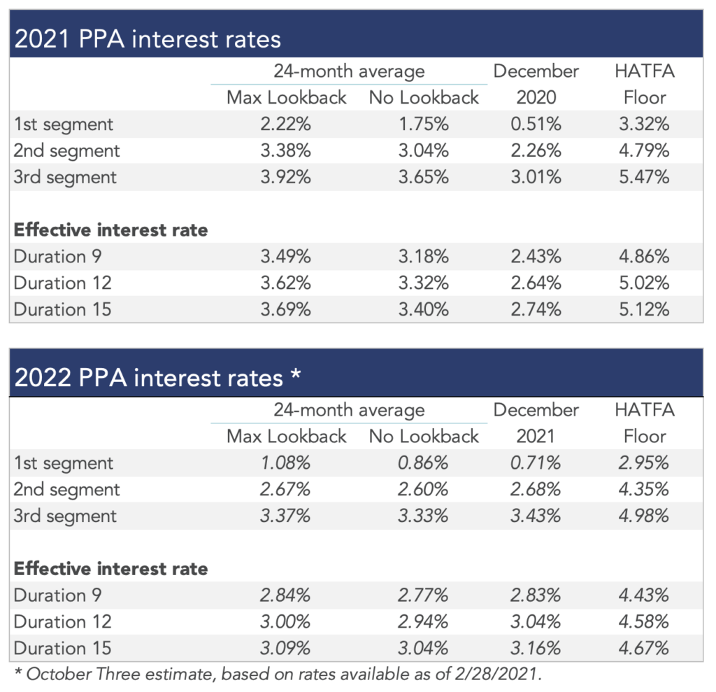 The table below summarizes rates that plan sponsors are required to use for IRS funding purposes for 2021, along with estimates for 2022. Pre-relief, both 24-month averages and December ‘spot’ rates, which are still required for some calculations, such as PBGC premiums, are also included.