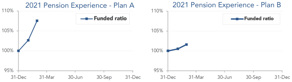 Pension finance has enjoyed a boost in early 2021 due to a spike in interest rates along with higher stock markets. The graphs below show the movement of assets and liabilities through the first two months of 2021: