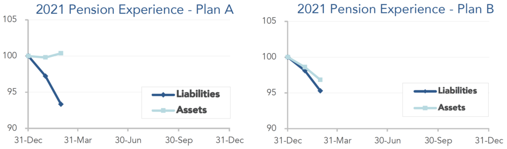 Corporate bond yields moved up 0.3% in January and are now up 0.5% since the end of 2020. As a result, pension liabilities fell 3%-5% during the month and are now down 5%-8% for the year, with long duration plans seeing the largest declines.