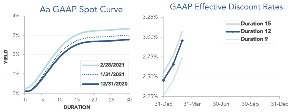 Pension liabilities (for funding, accounting, and de-risking purposes) are driven by market interest rates. The first graph below compares our Aa GAAP spot yield curve at December 31, 2020 and February 28, 2021, and it also shows the movement in the curve last month. The second graph below shows our estimate of movements in effective GAAP discount rates for pension obligations of various duration during January: