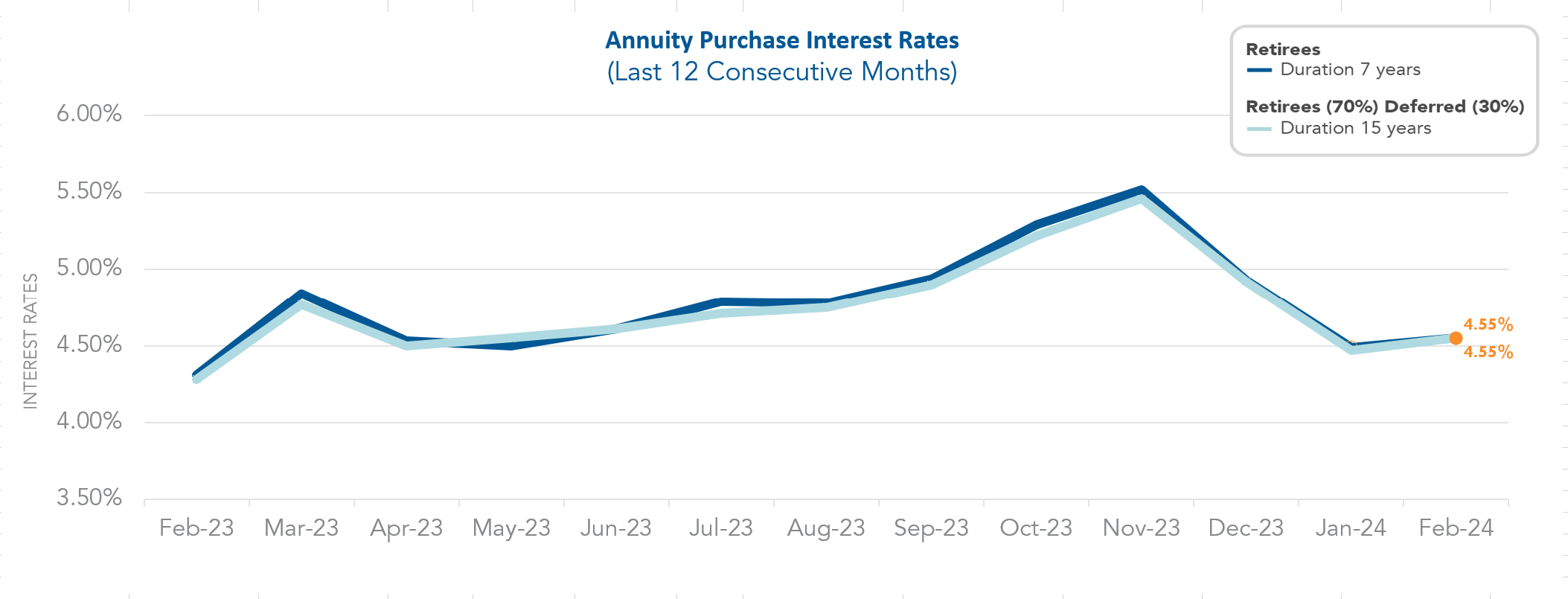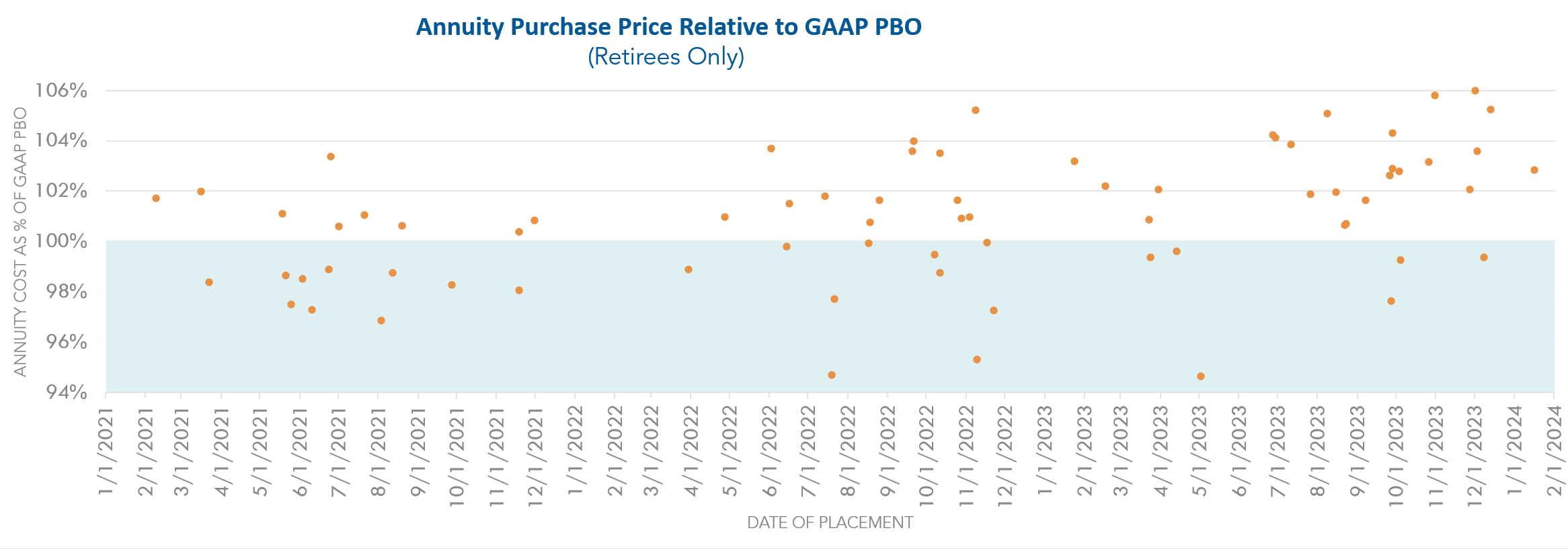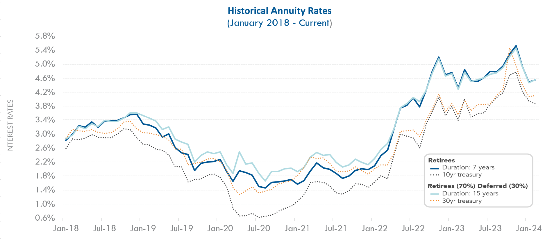 After experiencing a record-breaking year in 2023, the Pension Risk Transfer Market is seeing some spillover into 2024. As mentioned in the Pension Finance update, at the start of 2024, there was mild improvement in funded status, as mixed stock market returns were offset by higher interest rates. As of February 1st, average annuity purchase interest rates presented stability, with both the average duration 7 rate and average duration 15 rate tracking together at 4.55%. Since January, the average duration 7 rate increased 6 points and the average duration 15 annuity purchase rate increased 8 basis points. As we move through the first quarter of 2024, interest rates are presenting a steady pattern, yet their trajectory could potentially shift in the coming months which is why it is important for plan sponsors to act quickly as we continue into the year. Competition among insurers in the marketplace intensified throughout the last year fueling competitive bids. By the second half of the year, insurance companies were hitting capacity constraints leading them to reevaluate their underwriting guidelines – raising their minimum liability criteria and even requesting more lead time to review placements. It is crucial for plan sponsors to connect with an annuity search firm sooner rather than later to achieve their derisking goals, navigate the changes we are seeing in the marketplace, and achieve competitive pricing.