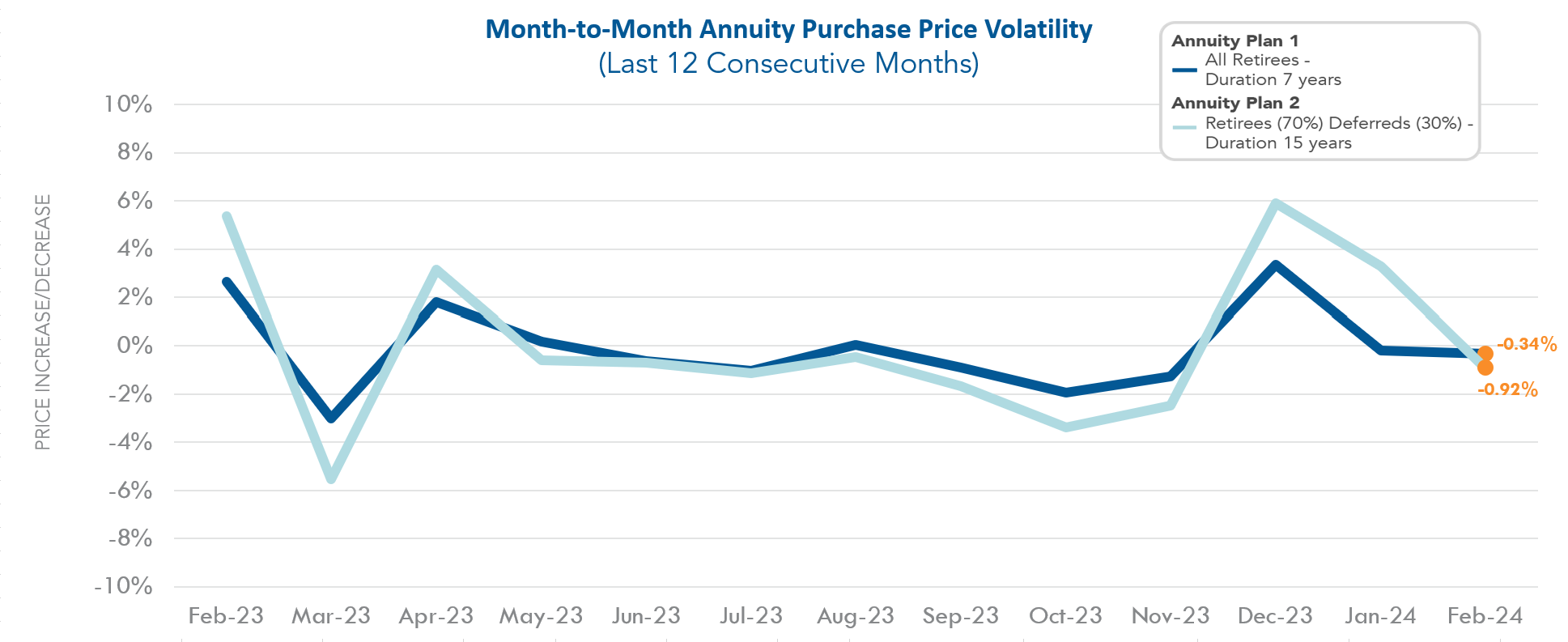 As you can see below, this month we observed a marginal decrease in prices across both hypothetical plans. This month the annuity purchase price decreased for Annuity Plan 1 by 0.92% and for Annuity Plan 2 by 0.34%. While the graph below shows month-to-month data changes, it is important to note that interest rates are subject to market conditions and fluctuate daily. As evident below, short-term volatility is present in the annuity purchase market and given this frequent volatility, it is wise to enter the marketplace early and be strategic with planning. Plan sponsors looking to derisk their pension plans could leverage the fluctuations and “lock-in” favorable rates by settling their retiree portion of their liabilities.