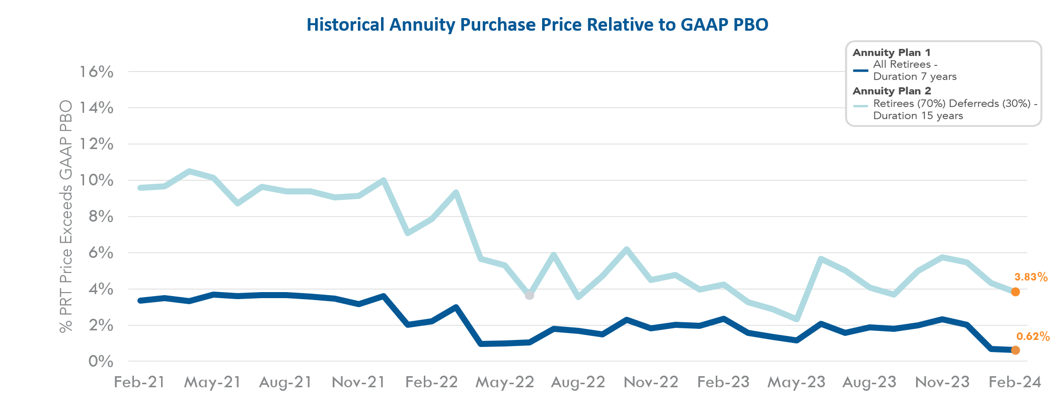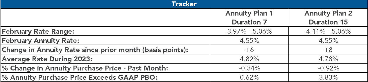 The graph below shows the spread between annuity purchase price above GAAP projected benefit obligation (PBO). We refer to GAAP PBO and accounting book value interchangeably. In the previous month, the spread between annuity purchase price above GAAP PBO slightly narrowed. For Annuity Plan 1, the spread decreased to 0.62% and Annuity Plan 2 reduced to 3.83%. The present margin remains lower than the average for the entirety of 2023. A decrease in annuity purchase rates inversely increases annuity purchase prices relative to accounting book value. Please note that the below PBO calculations exclude future overhead costs paid by plan sponsors to retain participants in the plan. Administrative expenses and PBGC premiums are examples of these overhead costs.